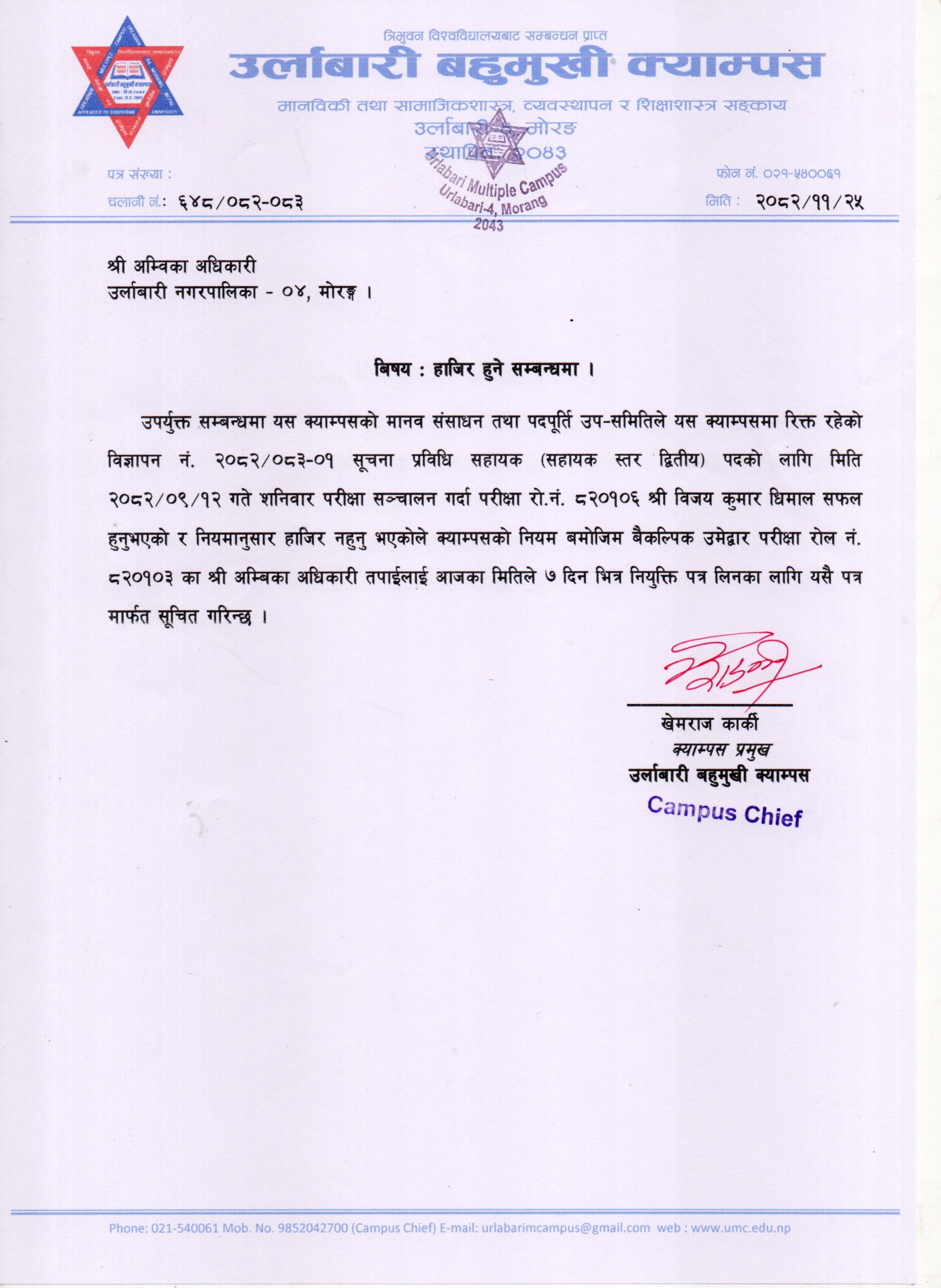 सहायक स्तर द्वितीय विज्ञापन नं. २०८२/२०८३–०१ का बैकल्पिक उम्मेदवारलाई हाजिर हुने सम्बन्धमा । by Urlabari Multiple Campus | Mar 9, 2026 | Notices | 0 comments सहायक स्तर द्वितीय विज्ञापन नं. २०८२/२०८३–०१ का बैकल्पिक उम्मेदवारलाई हाजिर हुने सम्बन्धमा । Submit a Comment Cancel replyYour email address will not be published. Required fields are marked *Comment * Name * Email * Website Save my name, email, and website in this browser for the next time I comment.